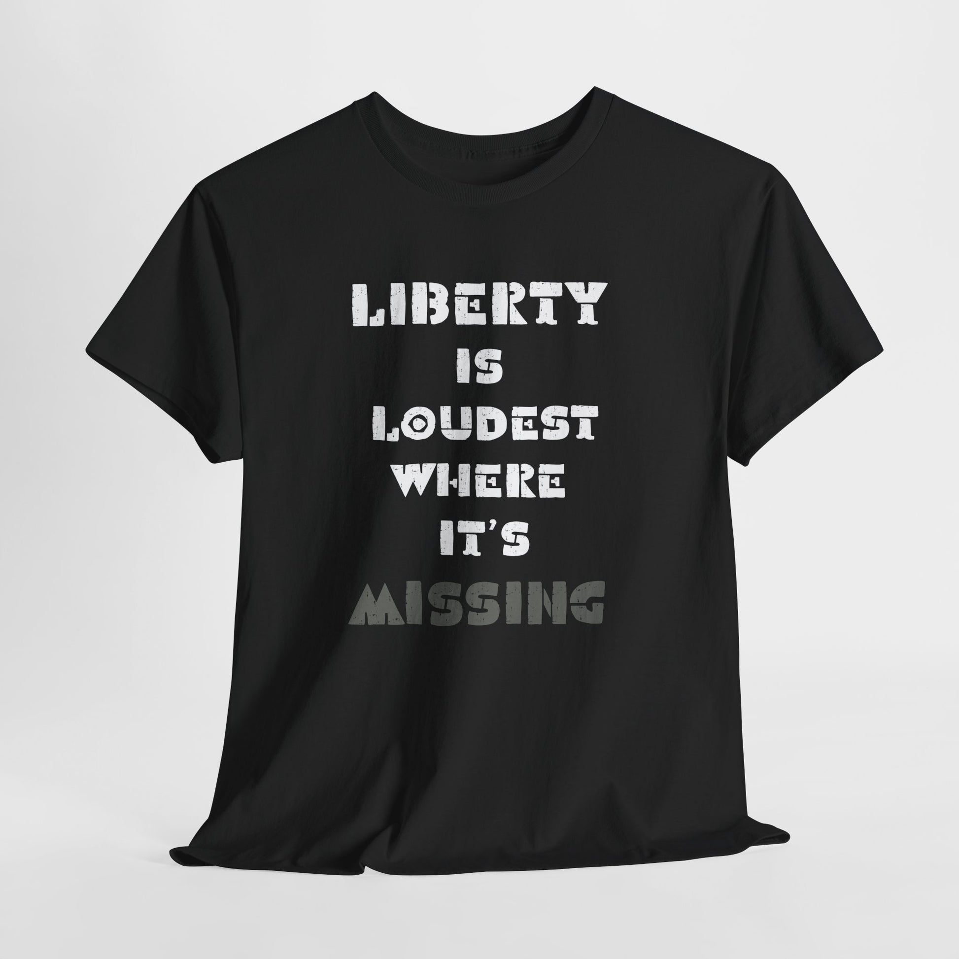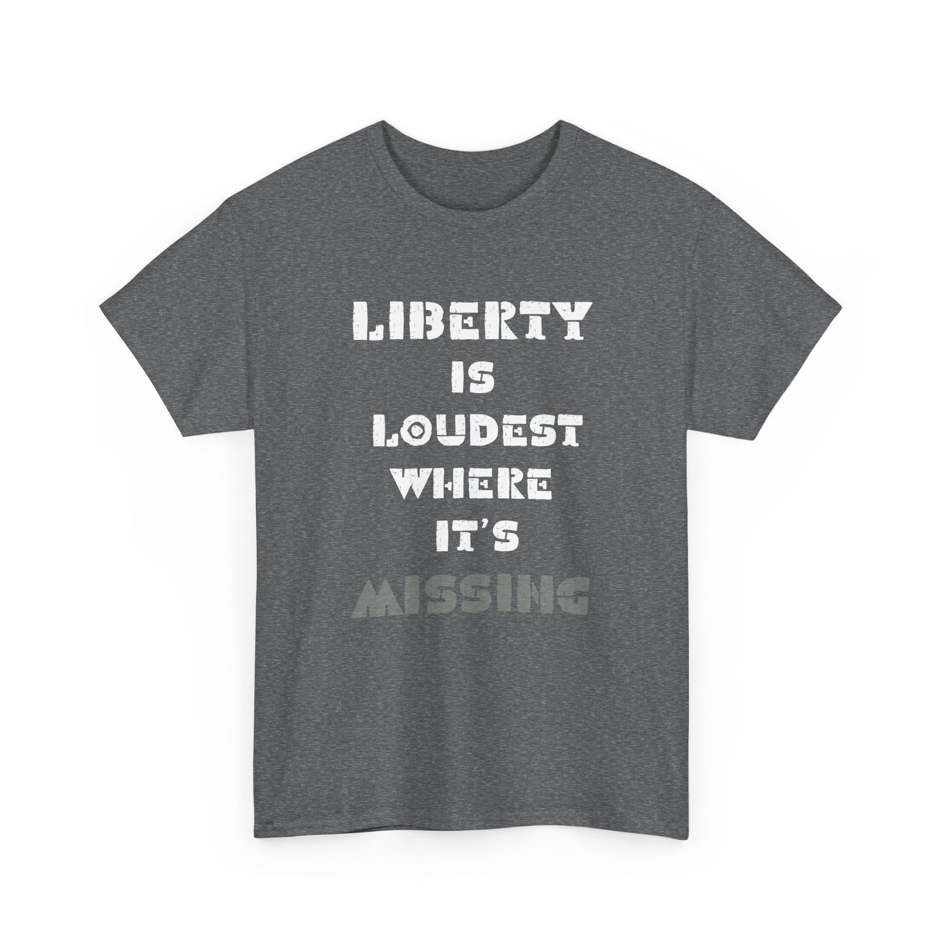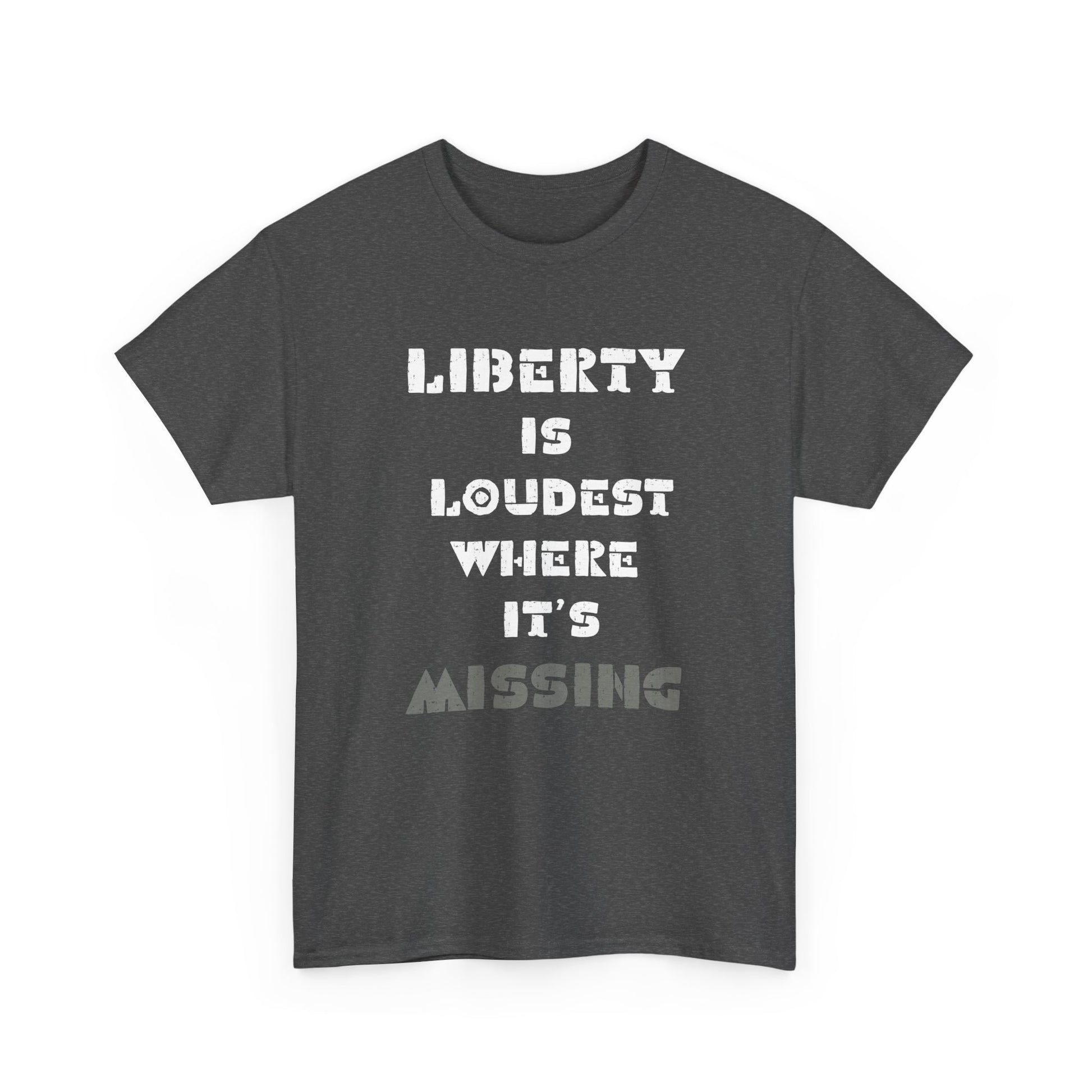 Introducing our Unisex Heavy Cotton Tee, designed for comfort and style. This classic fit shirt is perfect for casual outings or semi-formal gatherings, making it a versatile addition to any wardrobe. Crafted from high-quality cotton, it feels soft against the skin while providing durability for everyday wear. The message "Liberty is Loudest Where It's Missing" adds a bold statement to your outfit, encouraging meaningful conversations.