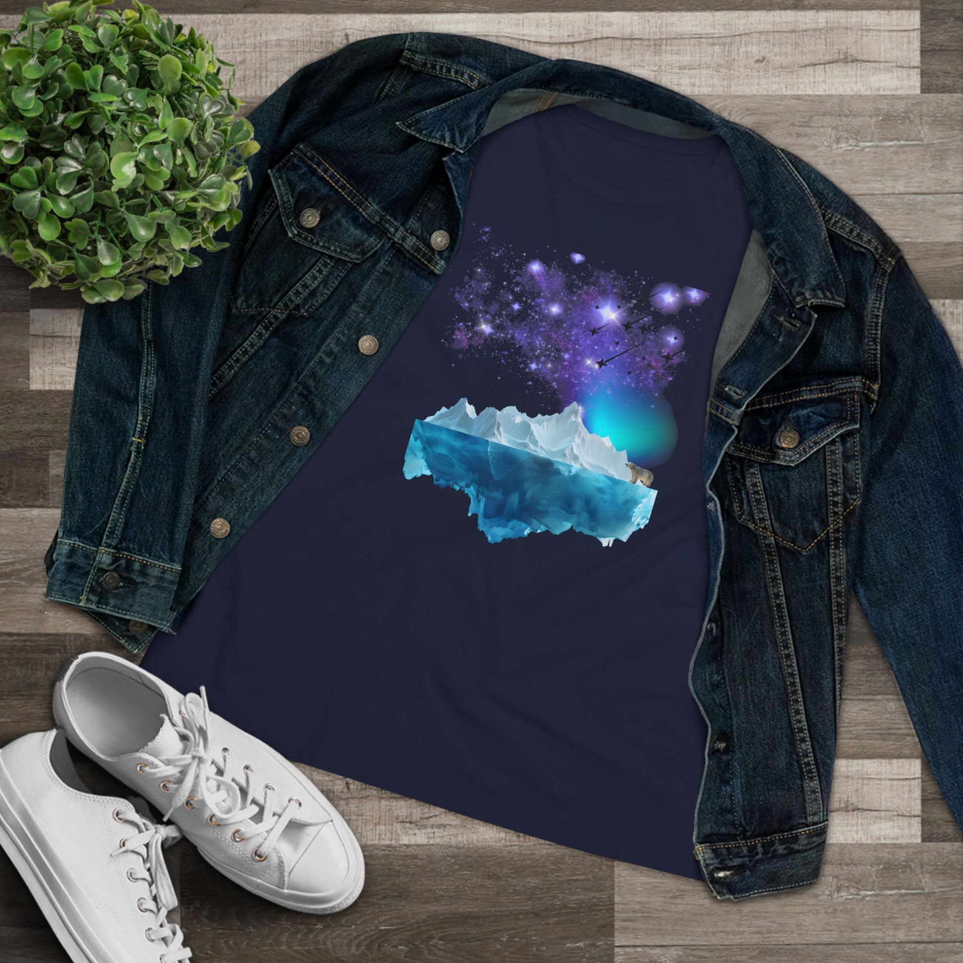 Under a sweep of green and violet, a lone polar bear lifts its muzzle to the sky. Shooting stars arc across the aurora while an iceberg drifts in silent blue water. This cotton tee carries that quiet cold, the hush of open sea and the sudden bright flare of starlight onto a comfortable, everyday shirt. Wear it alone or layered for a weekend event. It settles into your routine like a memory: soft against the skin, light enough for layering, and built to hold its shape through washes. For someone who notices constellations and cares about the small, still moments, this shirt is a way to keep that scene close at hand.