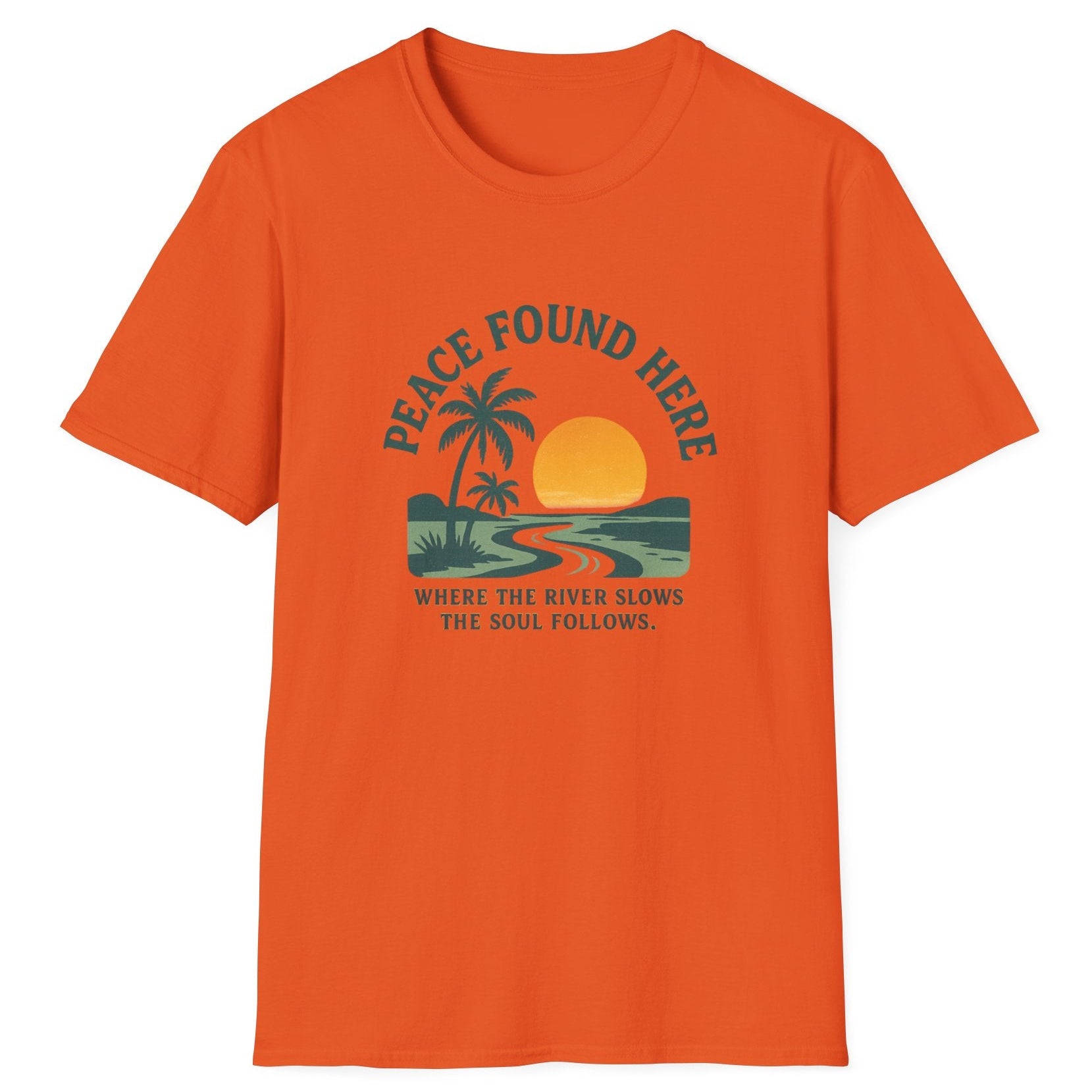 Peace Found Here. Where the river flows, the Soul follows. Embrace tranquility and express your love for serene landscapes with this stylish unisex soft style t-shirt. This shirt brings together a casual vibe with a message of peace, making it perfect for relaxation or gatherings with friends. Wear it while enjoying a day at the coast, at a BBQ, or lounging at home. It's ideal for those who appreciate nature and seek a calming aesthetic in their wardrobe. A great gift for birthdays, holidays, or just to show you care, this t-shirt resonates with anyone longing for a simpler, more peaceful life.