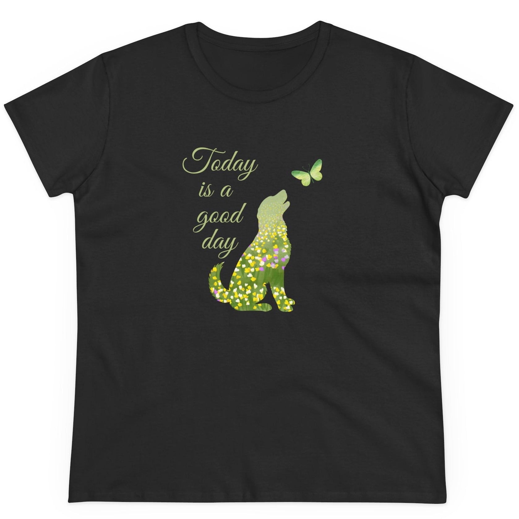Watching the connection between your best friend, who happens to be your dog, and a fluttering butterfly takes you to a relaxed, less stressful place. Soft, midweight cotton tee with a gentle, uplifting design: a floral-patterned dog silhouette gazes up at a tiny butterfly beside the handwritten phrase "Today is a good day." Lightweight yet durable, the semi-fitted cut flatters without clinging. Wear it for quiet morning walks, vet visits, or coffee with a friend. It it carries a calm, hopeful energy that pet lovers will recognize. The tear-away label, reinforced neck and shoulder tape, and double-stitched hems keep the shirt comfortable and ready for everyday life. It layers easily under sweaters or pairs with jeans for a relaxed, animal-loving look that brightens ordinary days.